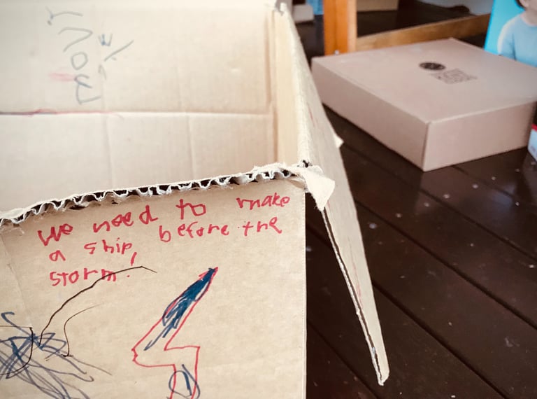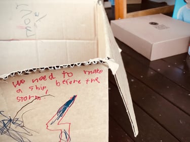 My kids were playing with cardboard boxes and pretending they were boats. I wasn’t really paying attention, but afterwards, I saw that my six-year-old had written an intriguing statement on the side of one of the boxes.